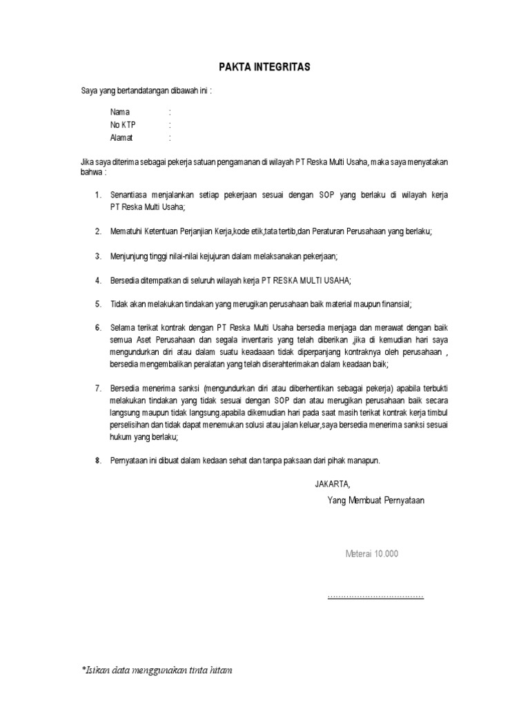 Form Pakta Integritas Pekerja Kai Services Pdf